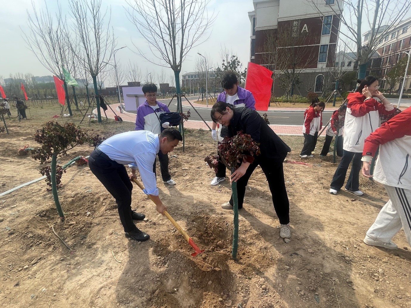 活动现场,在学校的统一部署、统筹安排下,人工智能与信息技术学院党总支书记崔琳、院长王磊带头参与,与计算机应用技术(中外合作办学)专业师生们一同投身植树劳动,大家热情高涨、干劲十足。活动中,崔琳书记、王磊院长与师生们分工明确、默契配合,有的挥锹铲土、整理树坑,有的小心翼翼扶苗扶正,有的俯身填坑踩实,有的提水浇灌,每一个环节都认真细致、有条不紊,现场一派热火朝天的劳动景象。经过大家的共同努力,一排排新栽的树苗迎风挺立、生机勃勃,为美丽校园增添了一抹鲜活的绿意,也寄托了师生们对绿色家园的美好期盼。