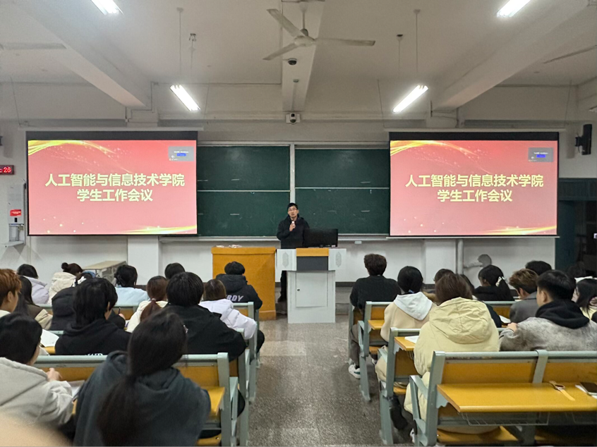 为提升学生工作效能,加强组织协同,2025年11月18日晚,人工智能与信息技术学院学生工作会议在郑州校区教C201召开,开封校区线上同步参与。会议由主席团杨瑜琼主持,党总支副书记杨帆及24级、25级全体学生会成员参加。